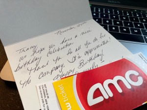 Yesterday I found a handwritten envelope in the mailbox among the golf magazines and holiday flyers. My initial thought was, “Our first Christmas card,” and I was mistaken. Inside I found two tickets to a movie and a handwritten note from our Co-CEO’s wife thanking me for my contribution to the company. I was speechless. A thoughtful card wishing me Happy Birthday and acknowledging my presence as a member of the team, made my day.